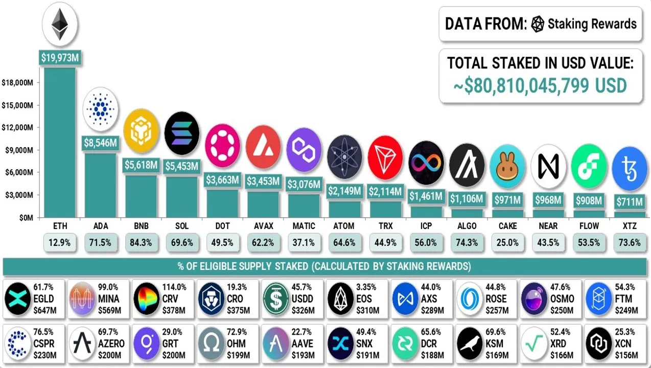 Due to the market, the staking market capitalization of most blockchains has declined. Ethereum retains a leading position, while Solana, which was previously ranked 2nd, is now surpassed by Cardano and BNBChain.